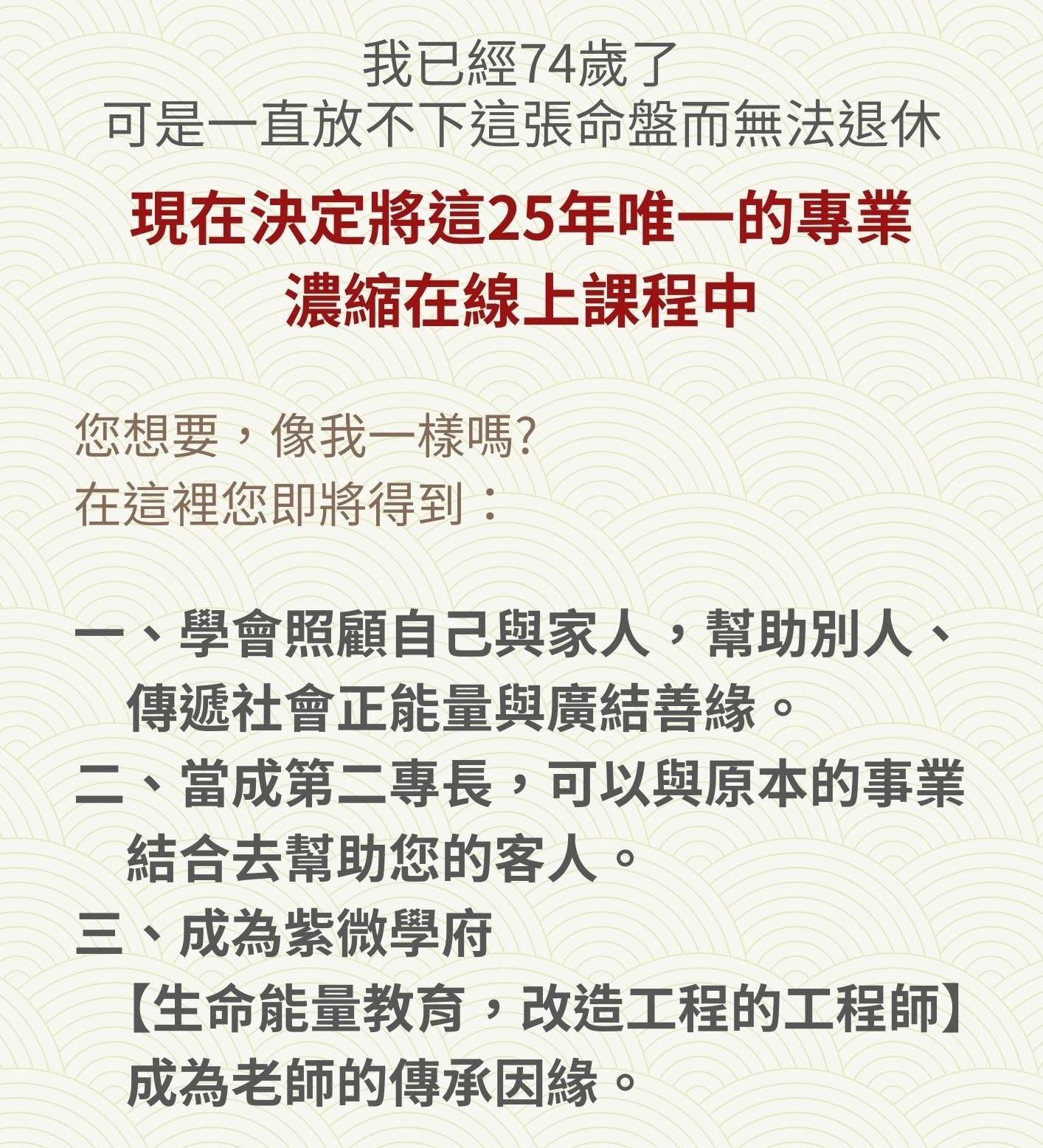 25 年來專注把紫微從玄學帶回生活運用:以佛法因果為根基,串起三方四正、四化星與祿存、十四主星、天刑與乙/丙級星,並以「面相+命盤」交叉驗證,形成清楚易學的判盤 SOP。